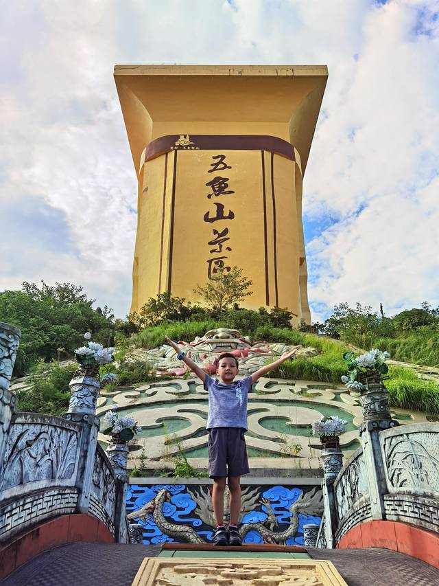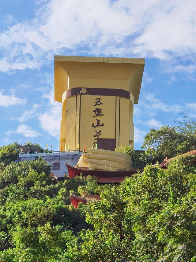 丰都玉皇圣地与丰都鬼城其实是邻居,两个景点之间相隔就一百米,而玉皇圣地是一个新开发的景点,可免费进入。但是上山的时候要坐景区的车上去山顶,要付15元的车费。到了山顶,有一个金黄色的建筑物写着“五鱼山景区”,原本这个建筑物是玉皇大帝的头像,听导游说旅游局规定旅游景点不准有这种头像出现,所以把玉帝的脸给削平了,但从远处看的话还是能看到玉帝的双手作辑的形状。(想看玉帝原貌的只能在去哪儿网上搜索以前的照片了。)