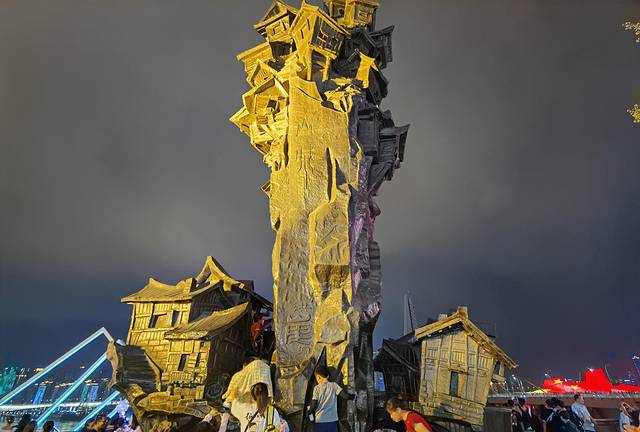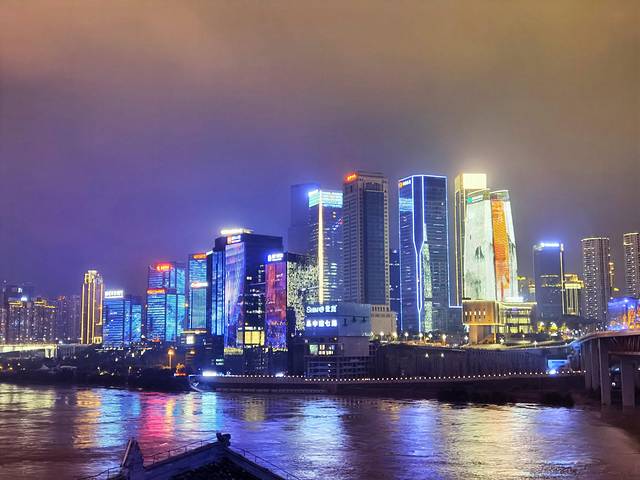 从洪崖洞的出口出来发现已经来到江边,这里回望后面的建筑很炫目,极具中国特色。
