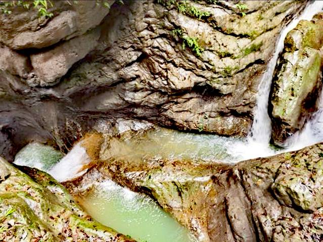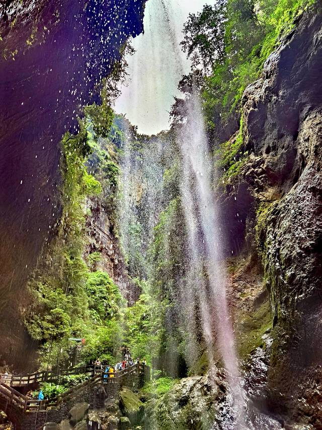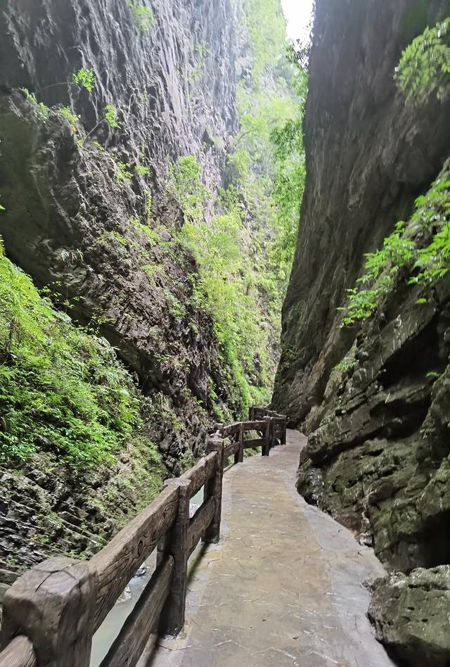 出了电梯之后就正式到达龙水峡地缝了。在地缝里面草木都很茂盛,而且好像与外面的世界隔绝了。这里只有一条路往前走,路是慢慢往下走的,就是说我们离地心越来越近了,看着这条通往地心的小径,感觉地缝里面也是很壮观的,抬头是天上来的流水,低头是深不见底的万丈深渊。刚刚的一场雨令此时的空气特别清新,地缝里面像是一个天然的氧吧,简直可以让肺部来一次大清洗。