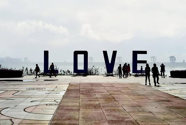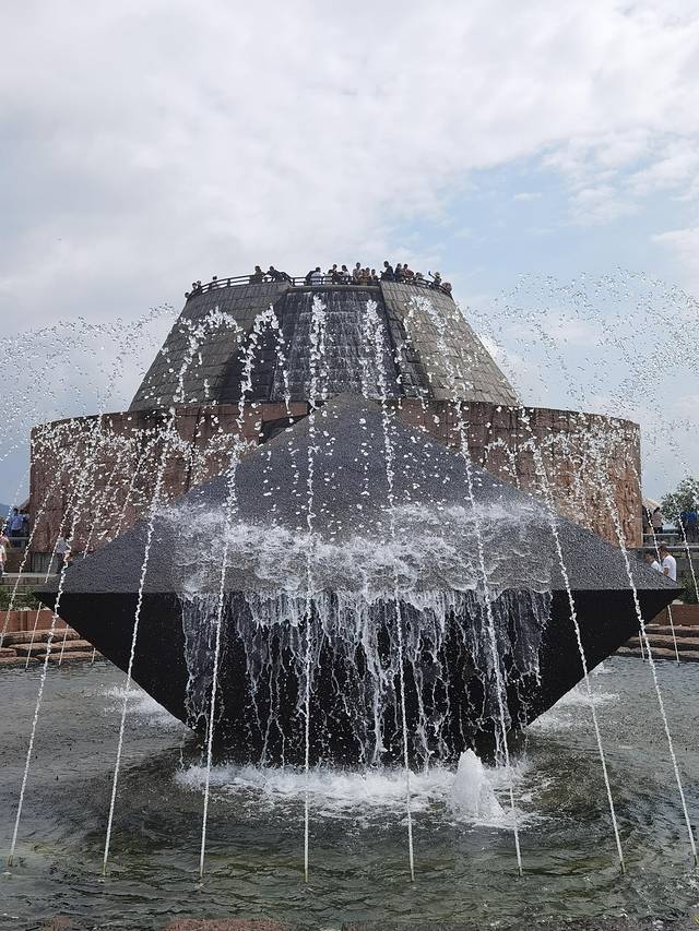 屈原故里外面的广场,后面就是三峡大坝,大坝正在泄洪,激起的水花令到江面一片迷雾。