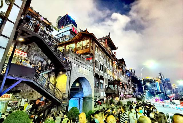从解放碑步行到洪崖洞民族风貌区只需十来分钟,一路有标示牌指引。这里是重庆市的网红地,入口处人头涌涌,只需扫码填写资料即可进入。我们来到这里时已是晚上八点多,洪崖洞靠近江边,看到江对面的大楼五颜六色,夜景十分美丽。这里面很多吃火锅或者麻辣烫的,但是应该非常辣,儿子不吃辣的,所以我们也没试,只是一路的看风景和看看这里的特色店铺。