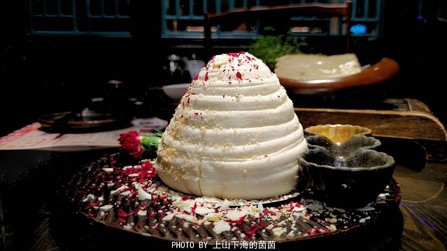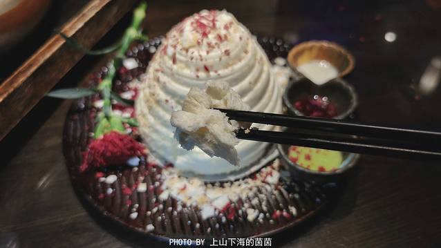 网红椰香花卷(¥35):主食的话首推浪漫度满分的“椰香花卷”!花卷上桌时白白胖胖的一坨,没想到液氮速冻的玫瑰花在拍打的瞬间“绽放”,为裹了一层薄薄椰蓉的花卷添了一抹红,煞是好看!