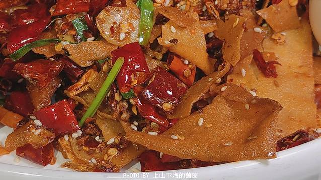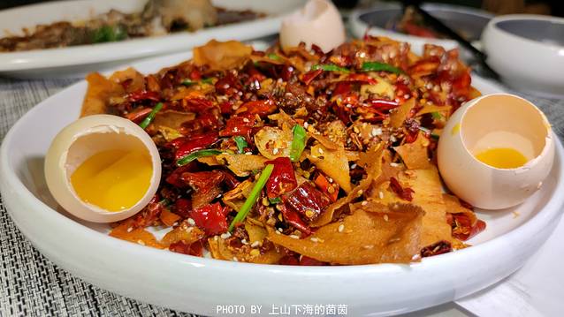 芒果辣子鸡(¥49):当传统川菜辣子鸡遇上分子料理芒果蛋,会是一种怎样的视觉和味蕾的体验?清爽香甜的芒果味“蛋黄”不仅卖相很讨喜,而且能将辣子鸡的油腻轻松缓解!