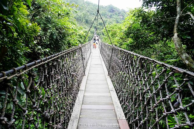 索桥横跨在青翠的山谷间,全长168米,离地近40米,是海南目前跨度最长、离地最高的铁索桥。没错,这就是《非诚勿扰2》海报上舒淇赤脚走过的那座大吊桥。