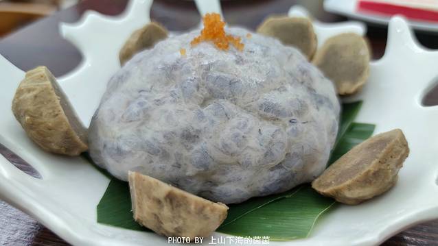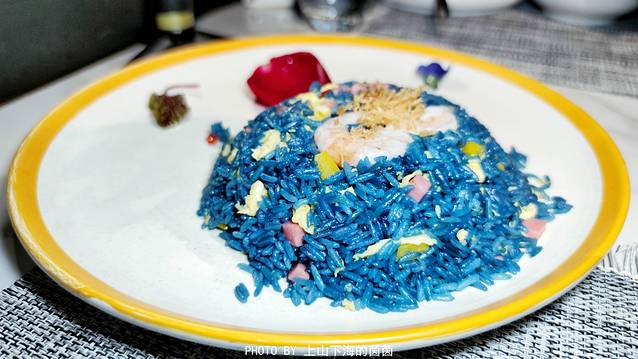 蓝色海洋炒饭(¥25):这道超梦幻的蓝色海洋炒饭不仅不是黑暗料理,而且绝对是颜控的最爱!含有天然花青素的蝶豆花让原本平淡的白米饭披上了浪漫蓝,就像玫瑰花里的蓝色妖姬超特别!