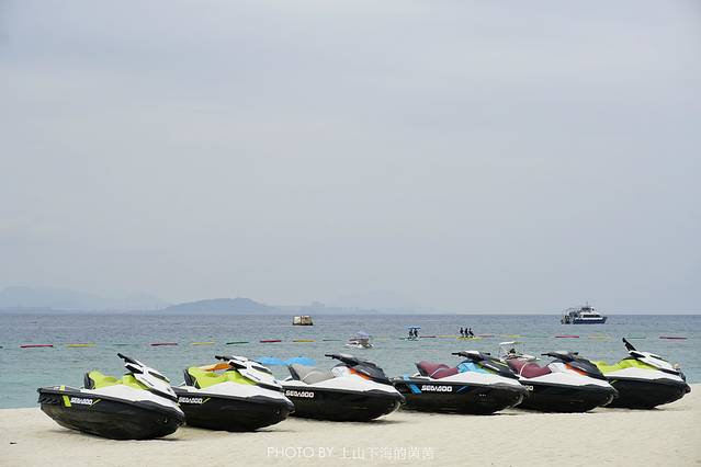 白沙滩是菲律宾长滩岛得以闻名世界的最大原因,现在不需要出国了,蜈支洲岛就有个mini版的。蓝天白云和蓝水白沙,阳光沙滩比基尼,这里统统都有。虽然珊瑚沙有点扎脚,但我还是喜欢光脚走在沙滩上,和渐变色的海水亲密接触。