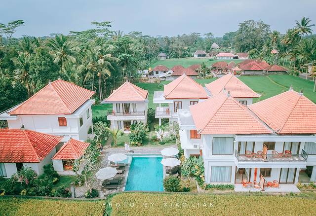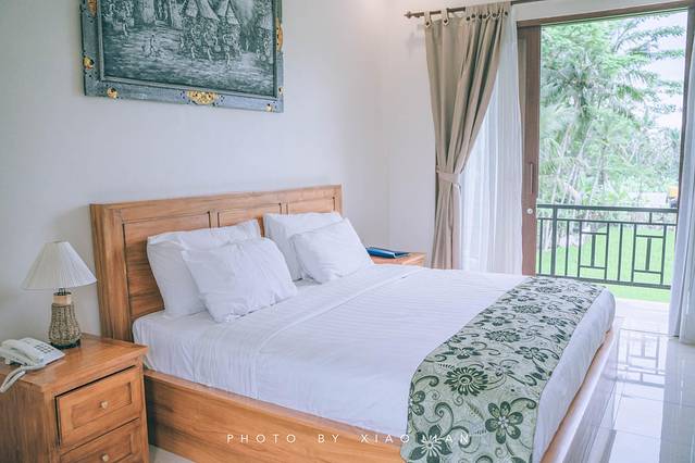当晚入住的酒店名叫:Kubu Bali Baik Villa & Resort,它是一座置身于稻田与椰林中的酒店,酒店内有好几栋小屋,推窗就可以看到大片稻田。