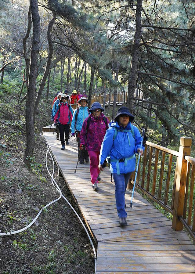 只见一群群穿着好看健身服的叔叔阿姨们,兴高采烈的迈着矫健的步伐走在蟒山的木栈道上。