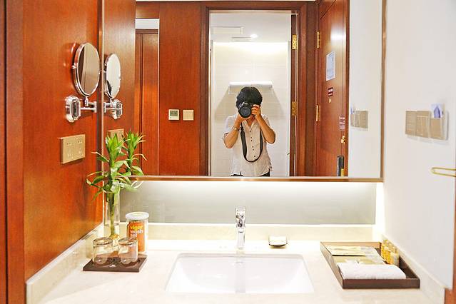 洗漱间一次性洗漱用品质量不错,洗漱台上的绿植生机盎然,洗漱台的对面是一个大大的浴缸,洗浴水流充足。