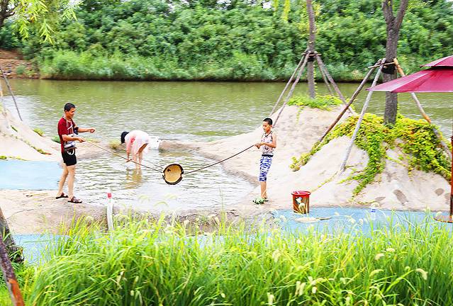 浑水摸鱼区,有全球首创的电子数控闸门技术控制区域进鱼数量,可实现千人不间断的捕鱼。潮起潮落项目也是全球唯一可以随时涨落潮的海滩,通过模拟自然潮汐,让游客可以不受涨退潮的时间限制,尽情体验渔家人“赶海拾贝”的收获喜悦。