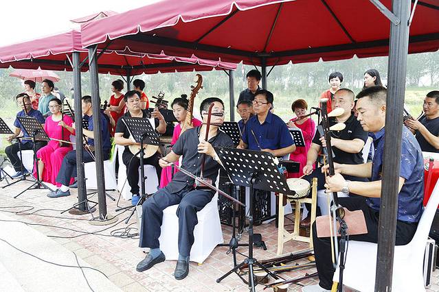 曹妃甸文化艺术节的舞台上上演着曲艺和戏曲,唐山是评剧的发源地,评剧作为地方戏曲艺术,在唐山有着深厚的群众基础。穿着普通衣服的唐山“粉末登场”乐队如痴如醉的吹拉弹奏,舞台上的本地票友演唱着评剧精典唱段,声乐响彻园区,引人振奋。