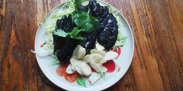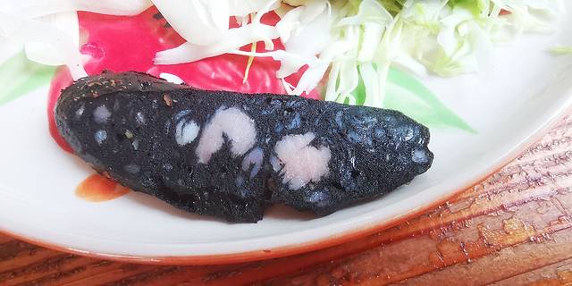 墨鱼香肠的成分是墨鱼、鱼糜、猪肉和木薯淀粉。但我感觉这个香肠满满的黑芝麻味。