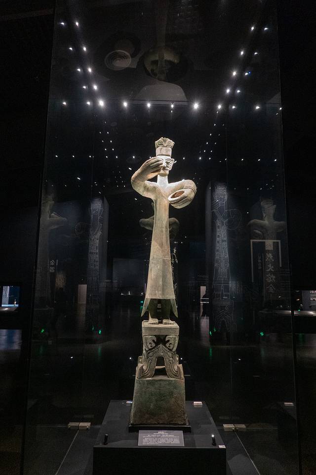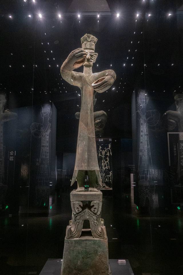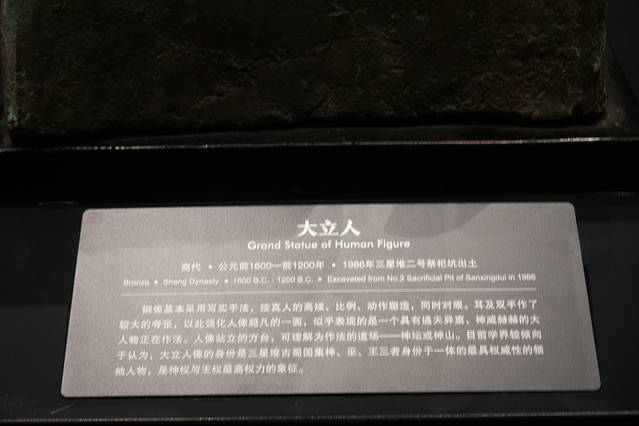 青铜大立人像,人像高180、通高260.8厘米,三星堆遗址二号祭祀坑出土。重约180公斤,是距今已有3000多年的历史的青铜器。雕像系采用分段浇铸法嵌铸而成,身体中空,分人像和底座两部分。人像头戴高冠,身穿窄袖与半臂式共三层衣,衣上纹饰繁复精丽,以龙纹为主,辅配鸟纹、虫纹和目纹等,身佩方格纹带饰,制作之精美细腻,迄今为止,在夏商周考古史上绝无仅有。其双手手型环握中空,两臂略呈环抱状构势于胸前。脚戴足锡,赤足站立于方形怪兽座上。其整体形象典重庄严,似乎表现的是一个具有通天异真、神威赫赫的大人物正在作法。