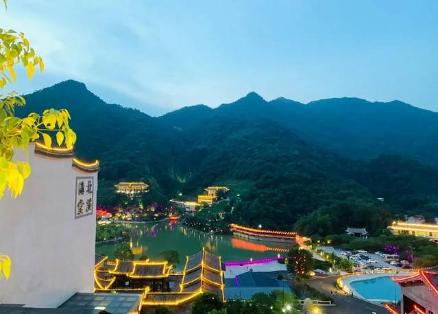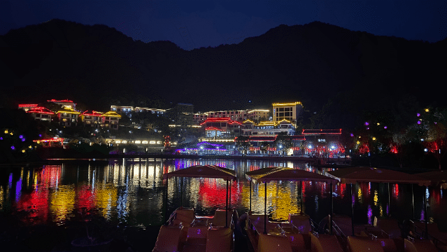 璀璨华灯倒映在水面上,犹如绚丽锦缎,环湖的霓虹灯火,点亮了山间的美,抬起头还有满屏且呼之欲出的星空。