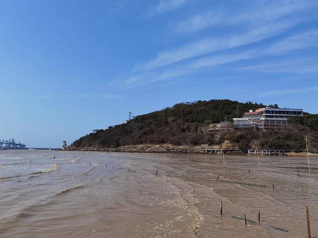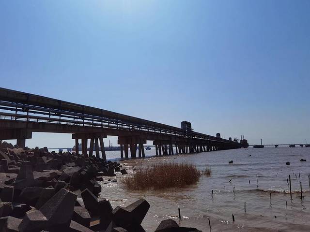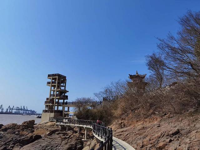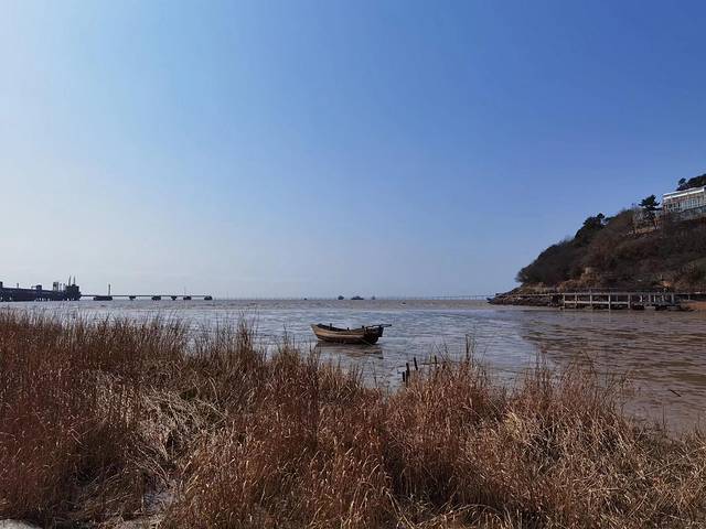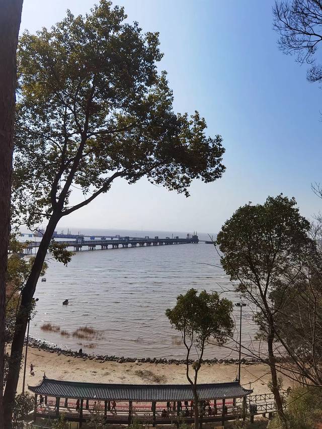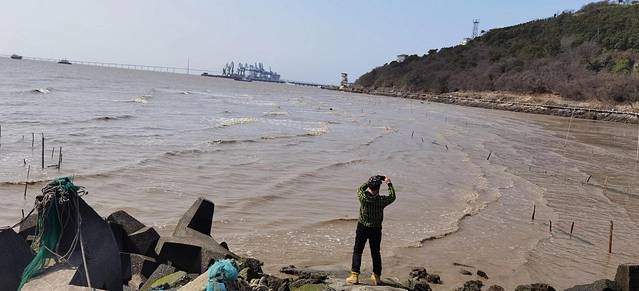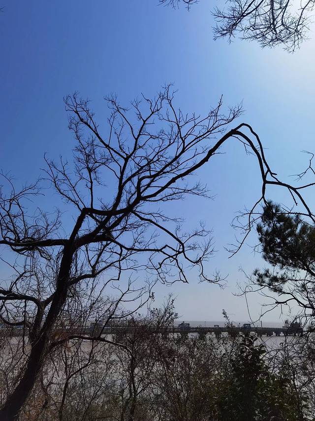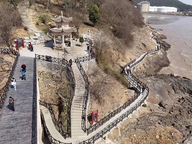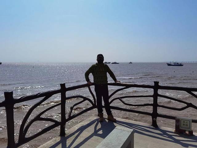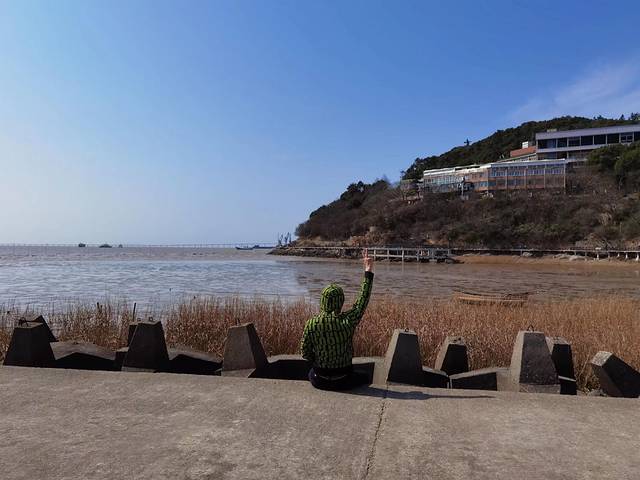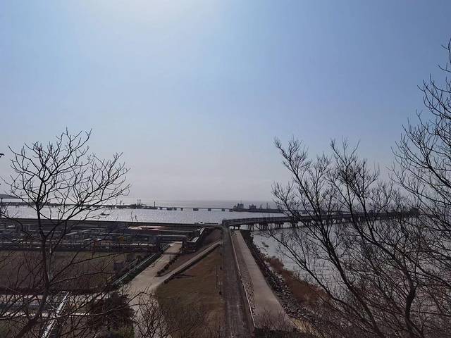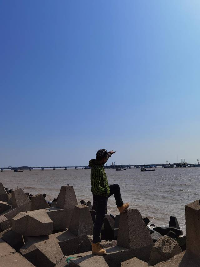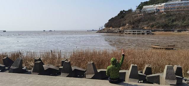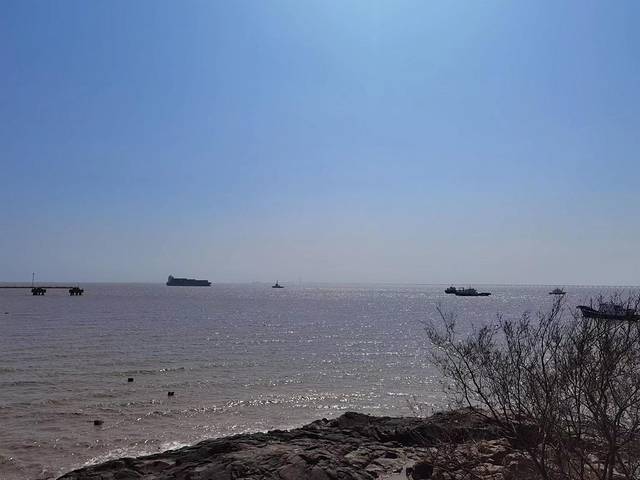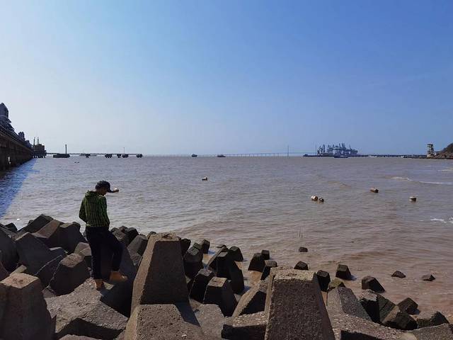 沿着海岸线曲曲弯弯,蜿蜒绵绵,近可看惊涛拍岸、海蚀景观,远可看海天一色、一望无垠;往西面看,可以看到远在天边、近在眼前的杭州湾大桥和港口,往东面看,可以看到油库的码头、引桥、油罐,往南面看,可以看到宽阔的海面和航行中的船泊,往北面看,九龙山就在身后,像一道屏障,屹立在大海边上。在大海边上,听哗哗涛声、看海鸥飞翔,静静的断片、傻傻的发呆,对我来说,其实是一件挺浪漫的事。