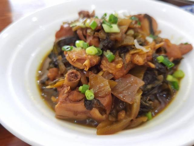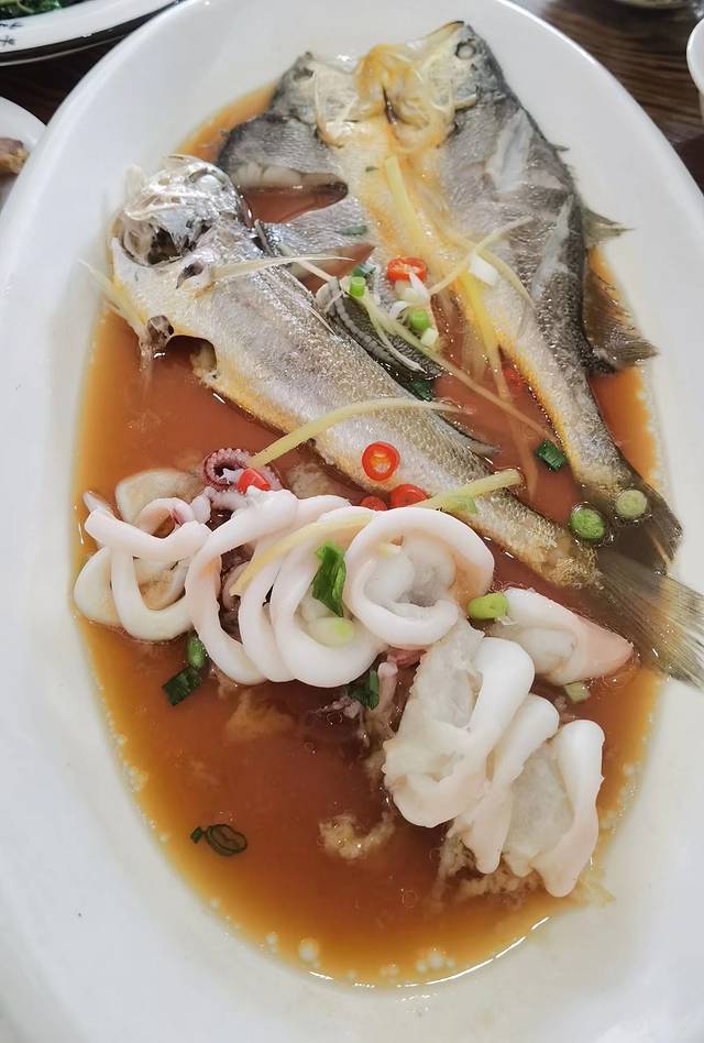 酒店上下两层,有包间、有大堂,菜还是挺多的,“雪里蕻菜卤炖小黄鱼”是乍浦的特色菜,据说是慈禧非常喜欢吃的一道菜,慈禧亲政后,为此传下谕旨:要乍浦每年鱼汛为她上贡小黄鱼,现在这道菜改良了,加了鲜鱿鱼一起炖,鲜上加鲜,种草!还有两个菜:“咸菜炒鸡”、“野猪肉肠”也是很好吃的哈!我喜欢吃干煎带鱼,这家酒楼做的very nice!