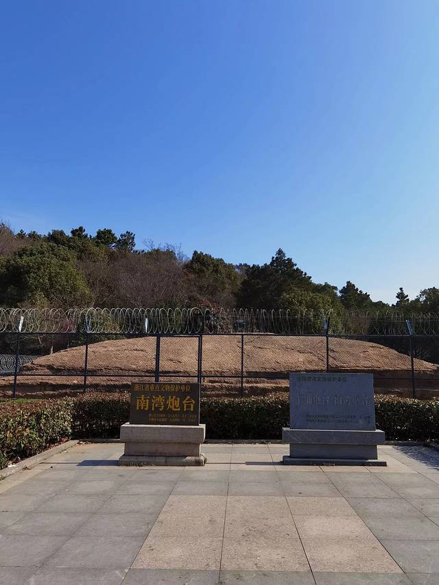据民国《平湖县续志》记载:南湾炮台为甲午战争以后,即光绪二十二年(1896年)建造,炮台坐北朝南,面向大海,两座炮台残高分别为4.15米和4.45米,炮台间置仿德国式的旧称“阿姆斯脱郎洋炮”一尊,炮身铸有“江南制造总局光绪戊子年(1888年)造”铭文,并镌有团龙纹饰,炮重16.7吨,炮身长433厘米,并附有炮座、炮架和机械传动装置,此炮当时共铸两门,完整保存至今的仅此一门,被称为“天下第一炮”,炮台曾在第一次鸦片战争中为抗击英军入侵乍浦发挥过重要作用。