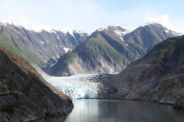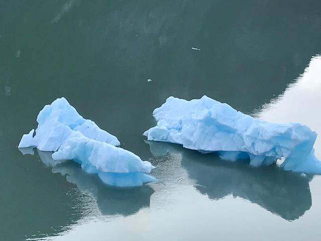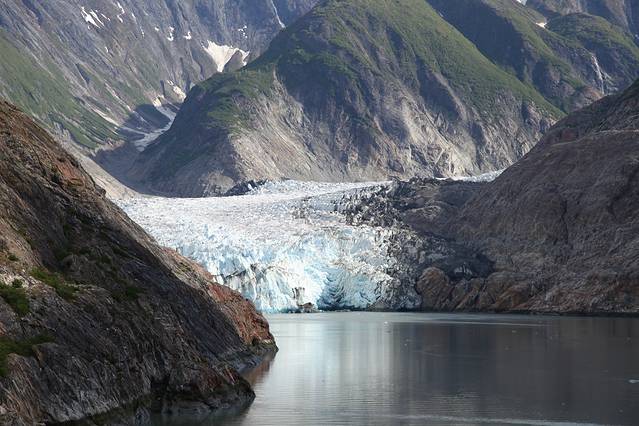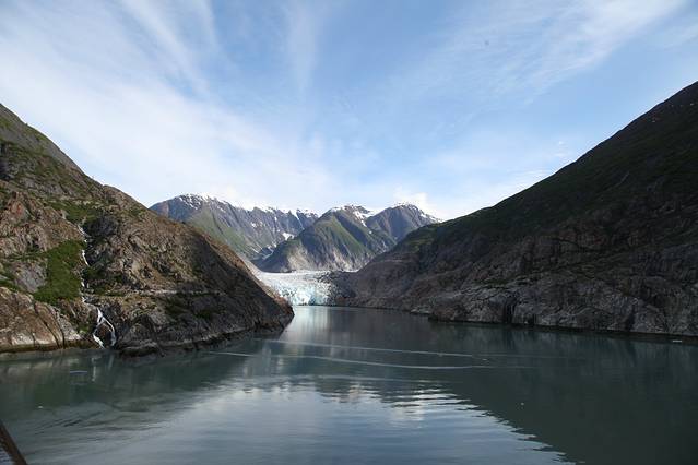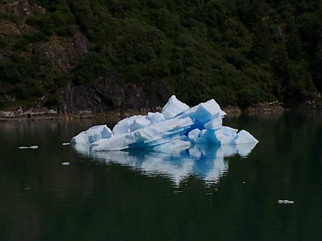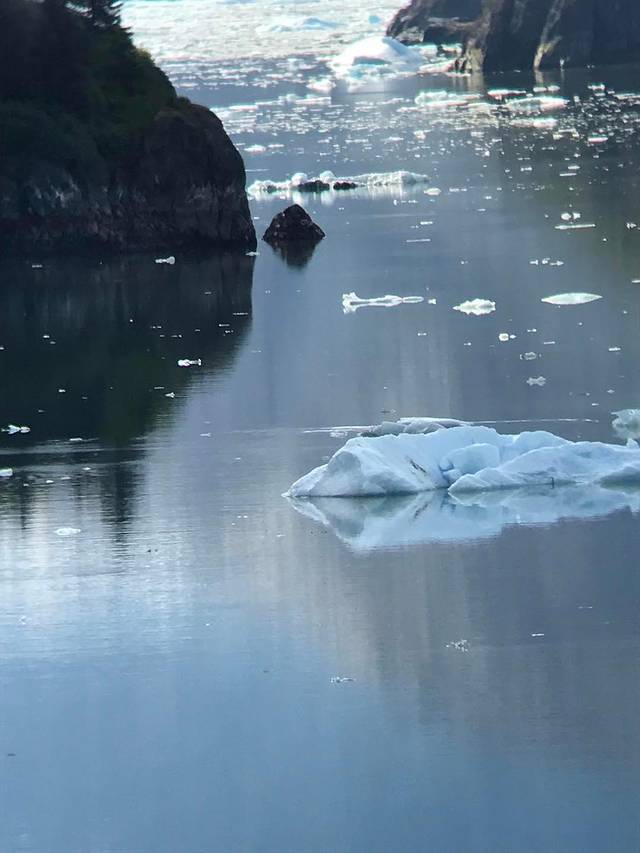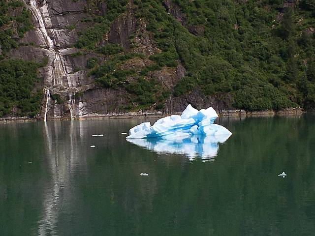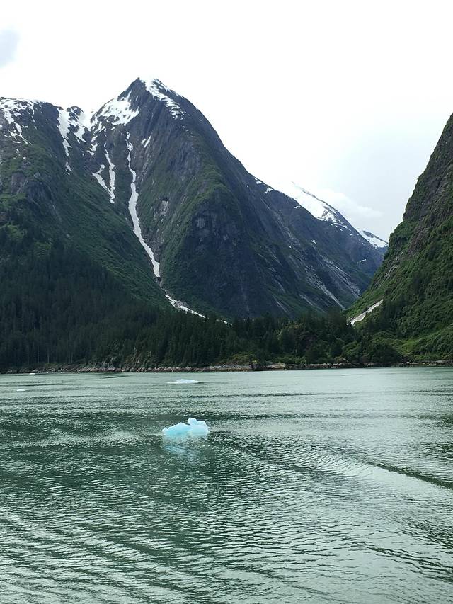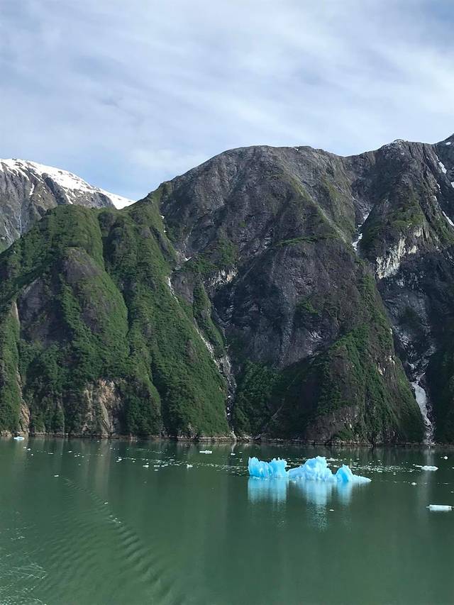 崔西湾又叫特雷西臂峡湾,以南北战争将军本杰明.特雷西命名,之所以有个臂,主要是它的形状像长长的手臂,是冰川侵蚀河谷后形成的峡谷,两边的陡峭石壁直上直下,水道越发显得狭长,这个距朱诺80公里的峡湾,有48公里长,两岸一片片茂密的森林和许多瀑布,秀色可餐。这里有许多阿拉斯加最大的冰川,这些冰川被头顶着雪冠的山峰在后方环抱着,越来越靠近它时,刚才还静谧壮美的冰川,突然间支离破碎,直冲入海中,在蔚蓝的大海上,漂浮开来,形状各异,在阳光下玲珑剔透,在阿拉斯加看到这人间奇景,一生能有几回。你平时不能感觉到地球气候变暖,此时此刻是不是有点惊醒。