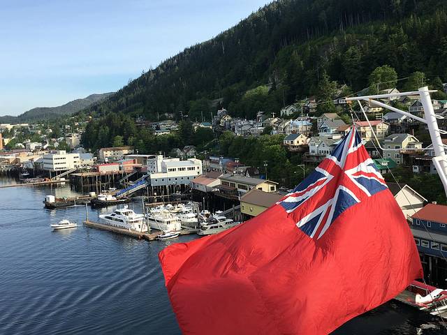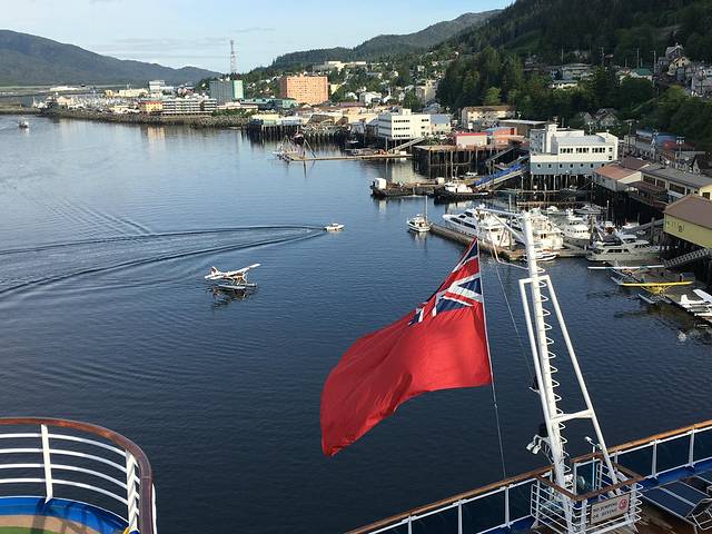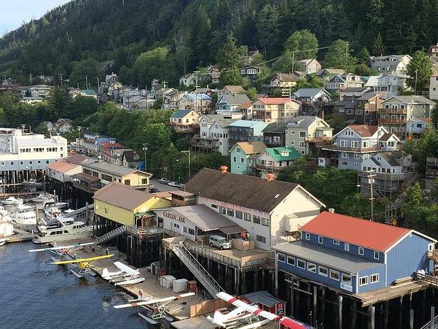 在茫茫的北太平洋上漂了一天,清晨走到阳台上第一眼看见陆地时的感觉是我有生以来第一次,激动的无以言表,一是被眼前的景色震呆了,一是好像多久没有看见陆地了。这里就是科奇坎Ketchikan,一个阿拉斯加最南面的城市,依山面建,正好在海湾里,安静、悠闲,美极了,鲑鱼之乡、图腾之地、熊的老家。红色A字型屋顶的木屋在山坡上差落有致,海湾停了许多游艇,由于终年多雨,山腰上云雾飘渺,整个城市看来湿湿润润。