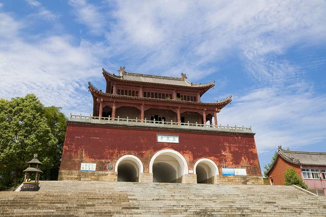 景区有中国最早的关庙——显烈祠等三国遗迹和宗教遗址,进入景区就能看到雕像,这里其实是三朝国师神秀的归葬之地。我们在玉泉寺山门牌坊(也叫三圆门)上发现“三楚名山”四个大字。从山门进入从左至右是三尊有名的佛像,其中一座就是佛教创始人释迦牟尼。
