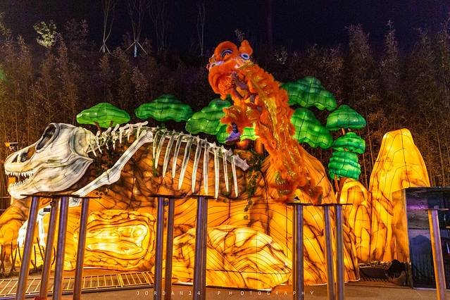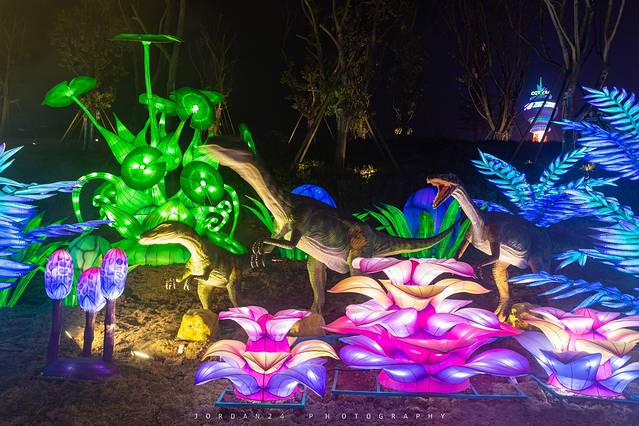 “奇幻侏罗纪”灯组演绎了陨石坠落、生命起源、穿越时空回到过去的故事场景,穿越三叠纪-侏罗纪-白垩纪三个时代的奇幻历险记。