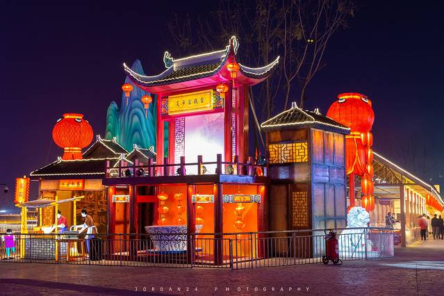 盐街灯市灯组就是以掌灯报时“十二时辰”为设计理念,每个时辰对应一盏灯,在栉比鳞次的建筑之间,营造出灯火辉煌、如梦似幻的繁华街景。