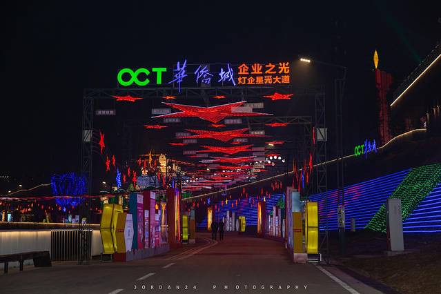 “企业之光”灯组以暖色调为主基色,运用光彩夺目的五角星装饰区域,倾心打造了十二个星光展位,彩灯企业可在此展出优秀的灯组作品和企业信息,顶部悬挂近百个全国彩灯企业铭牌,彰显华侨城搭建彩灯产业腾飞平台的初衷;同时,区域融入十二生肖纸雕灯,游客在此可以与生肖纸雕灯拍照打卡,在一片热烈中感受浓厚的彩灯企业文化。