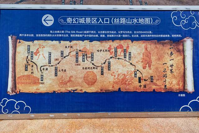 自驾车辆可以停在门口的停车场空地里,目前都是免费的。丝绸之路相信不用我多说了吧?这是条连接中、西方的商道,时间可以追溯到西汉时期,当年汉武帝派张骞出使西域的目的之一正是为了开辟这条商道,它以首都长安为起点,途径我国甘肃、新疆等地,最后到达中亚及西亚地区甚至连接到了地中海各国,进门的阿拉伯魔毯喷泉便是西域文化的代表之一。