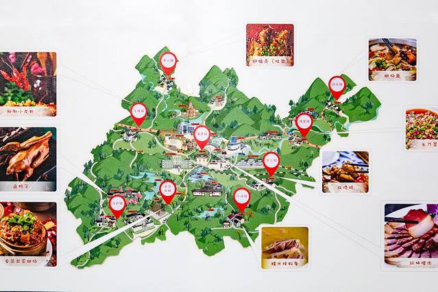 玉峰镇的秘制小龙虾、河边镇的卤鸭子、卓筒井镇的蒸肥肠、象山镇的母猪壳(桂鱼)、回马镇的肥肠鱼、隆盛镇的头刀菜、金云镇的红烧鸡、蓬莱镇的红林腊肉、天保镇的糯米炖粉条等等……在这个美食街都能找到一些。