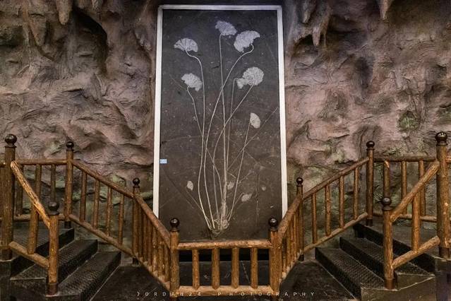 墙壁上,一幅水墨荷花倒挂?其实它不是画,而是化石;也不是荷花,而是海百合。这件海百合化石就是我们的四号“镇馆之宝”。这具化石高3.65米,宽1.86米。海百合也不是植物而是动物,是一种生活于海洋中的棘皮浮游生物,根在上,叶在下,倒着生长,随波逐流。从观赏的角度看,这件标本有茎有花有叶,个体巨大,姿态优美,形态完整,品相出众,堪称海百合化石中的精品。