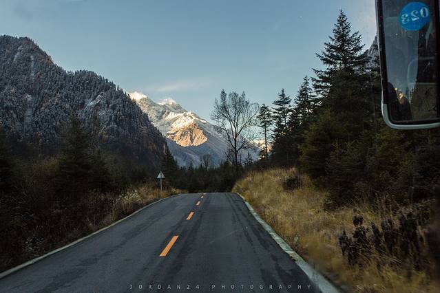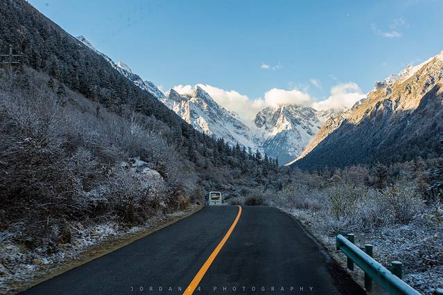 想象下……车辆行驶在碧水旁,两岸的高山、彩林,天空不时泛起青雾,太阳前方的雪上尖上……