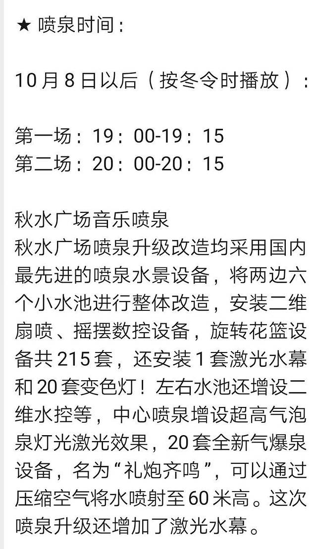 我总结的观秀妙招是六点到秋水广场可以抢坐在第二排,这里是绝佳位置,旁边就有一条美食街(味道一般般啦,价格高高啦),等到主喷停止喷以后拽着同伴赶紧往地铁口跑,等你到地铁口的时候喷泉宣布结束,你就能最快最不挤的离开秋水广场,不然排队以及没信号让你崩溃,这个方法我试了四五六次百试百灵!