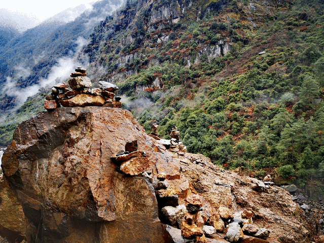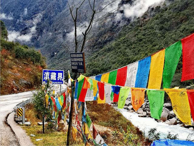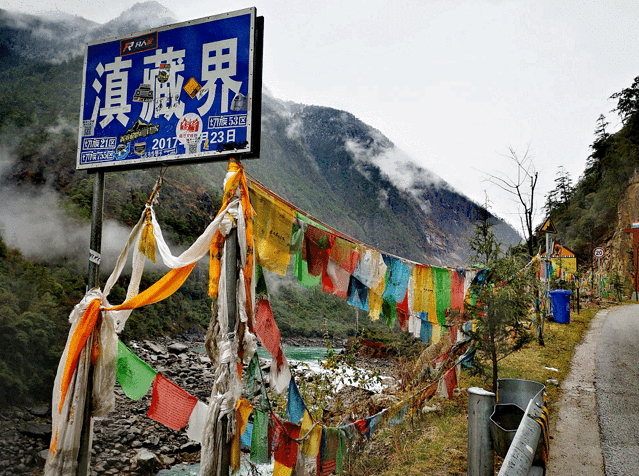 滇藏界最明显的标志就是鲜艳的五彩经幡,走到近处会看到一座峭壁上贴了西藏俩大字,旁边立了些介绍牌,还有往来的信徒摆放的玛尼堆。