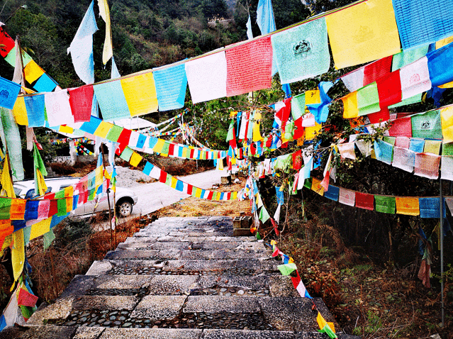 从观景台出来,在下山返程的路上会看到有个地方布满五彩经幡。
