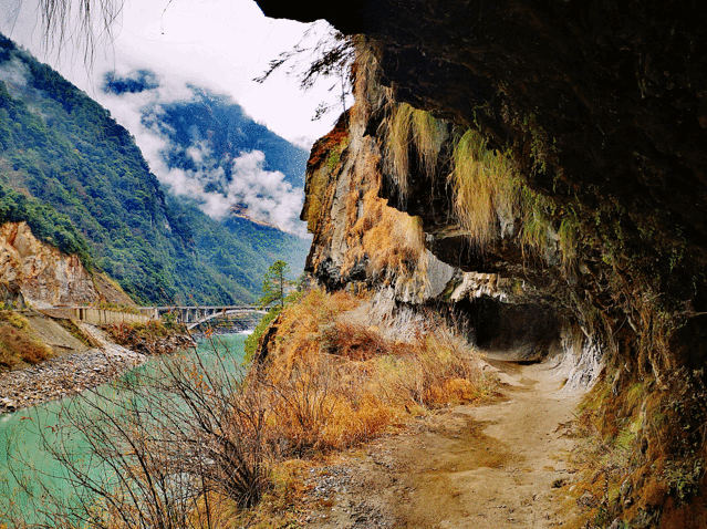 这条古道是全靠人工在峭壁上凿出来的,古人是真的厉害,把“没有条件创造条件”发挥得淋漓尽致。有些地方还凿出了遮雨棚,遇上天气不好也能在这里躲避,就是那个年代的天然旅馆。
