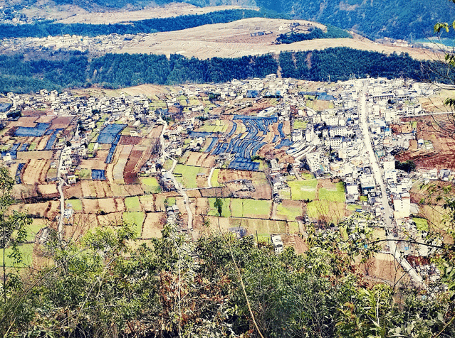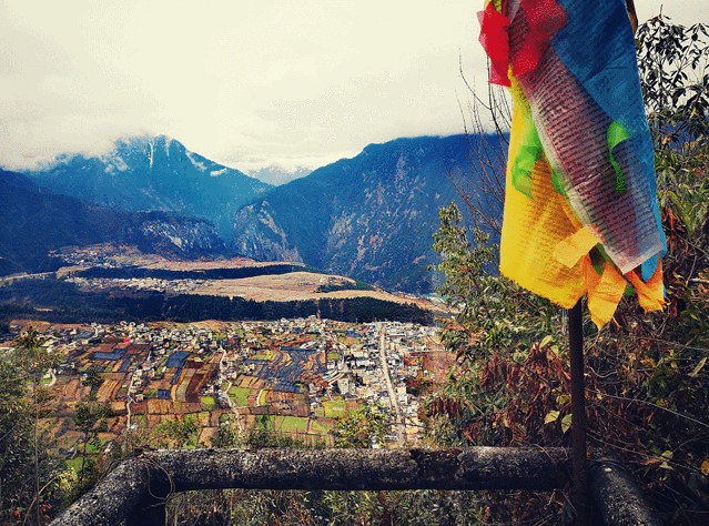 寺院很小,除了白塔,后面还有一简易建筑,大概是供朝拜的人短暂休息的,绕到塔的另一侧会有个小惊喜,一座迷你观景台能俯瞰到丙中洛小镇全貌,视野超级完美。