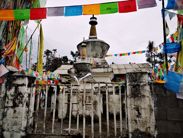 沿着小路往前走一小段,会看到一座白塔坐落在半山腰,这是当地人朝圣的地方,每逢佛教重大节日,信众会爬贡当神山绕塔祈福。