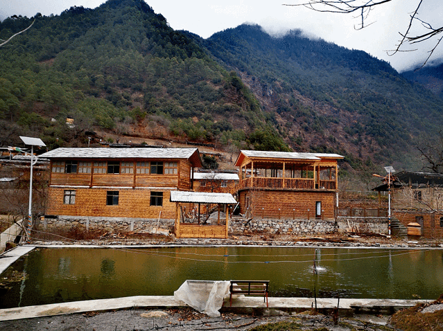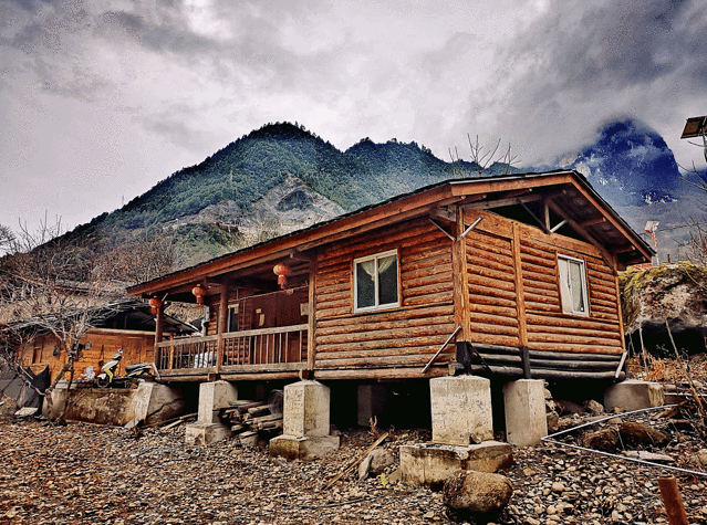 桃花岛地势平坦一些,有些地方视野开阔,这些怒族民居看起来倒像是丛林里的小木屋。