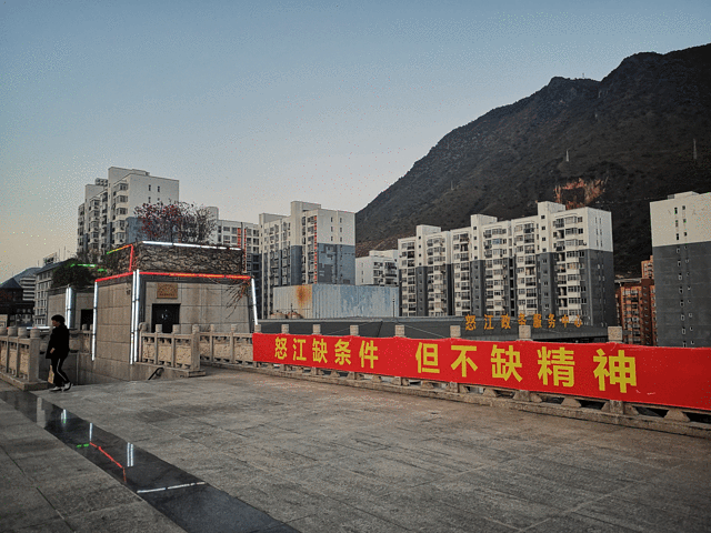 举个例子,拿怒江州政府所在地六库来说,你是没法在这城市骑自行车的,马路坡度很大,步行久了都吃力,像爬山一样。下图是在怒江州政府前的广场拍的。