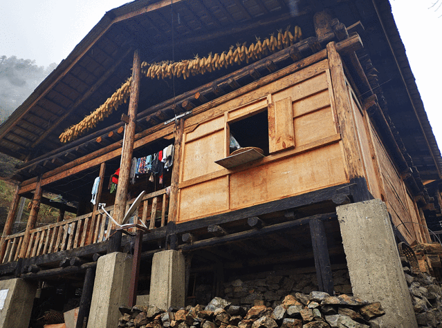 返程的路上拍几张村里的房子,几乎都是下图这样,一层架空,二楼起居,门上挂玉米和经幡,院子里有牲口棚。据说这些民居也是为了发展旅游业在政府的统一要求下保持原始风貌的,住在这儿是不能盖砖瓦房的,都是住这样的木头房子。