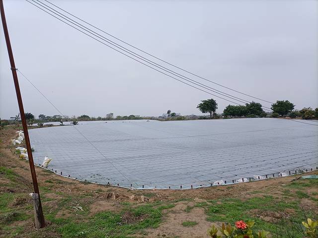 进村道路两旁,很多这种鱼塘,我起初以为是种菜的大棚,但后来发现是鱼塘。鱼塘里搭了架,然后铺上尼龙胶纸,用网格线固定。不知是养殖什么。