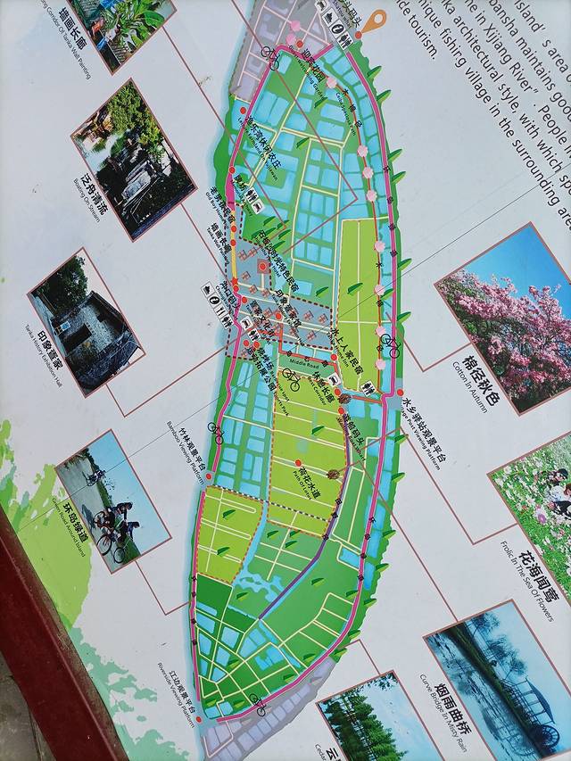 渡船到岸就是游客服务中心,有游玩地图。旁边有观光电瓶车。如果不想走路,强烈建议坐观光电瓶车。因为我们没坐电瓶车,后来被坑了。从渡口往前大概一百米,有个岔路口,这里有租四轮自行车:单排40元、两排60元、三排的80元。两大两小租了个两排座的四轮自行车60元。其实从渡口走路到村口牌坊大概六七百米,村里走不了四轮自行车。我们被坑是因为,租车到了牌坊旁食饭,车放餐厅院子里。食完饭就到村里到处走走。逛了一轮,取了四轮自行车然后往回走,打算绕岛走一圈,但是到了租车大叔哪儿,就不让骑了。当时租车时说好可以让骑一整天再还车。没办法,没有写合同租多久,都是口说的,还车回程吧。也就是说,我们骑了大概一公里多点,中午12点多租车,连食饭逛村子下午3点还车,花了60元,感觉这是个大坑,想绕岛的愿望落空。这个大叔别怪砸你饭碗,主要是你太不厚道。对游客不够友好。
