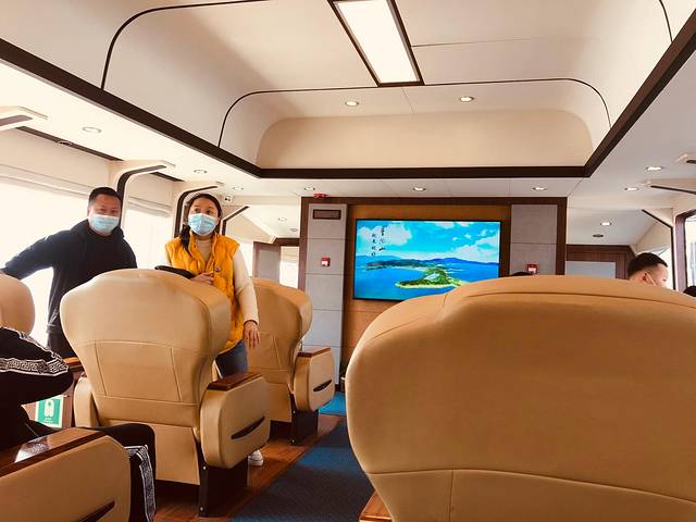 订好了普通的船票,但硬是被黑压压的离岛的人群吓住了,害怕赶不上下午2:00回沪的大巴,果断退了票,买了奢侈的商务票,100元/张,真的是一分钱一分货,三分钟就到了朱家尖,而且那个座位是相当不错,舒服,超宽超大,还有水和食物赠送。