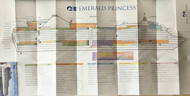 每人都份游轮的布局图,可以充分了解乘坐的这条船,有哪些活动场所,比如健身方面包括泳池、健身房、球场等,或者美食方面,有几个餐厅分别在几层,有哪些的特色餐馆,以及影院、秀场等演艺场所。