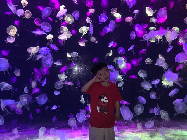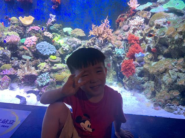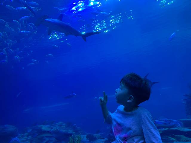 工作人员会带我们参观海牛馆,讲解的声音很好听。差不多8:30回到鲸鲨馆,这时帐篷已经搭好咯,每个家庭找到自己的帐篷位置就好了,工作人员会介绍活动安排和注意事项,每个家庭派一个人听一下就好了。弄完了之后就可以排队领号冲凉了哦。冲凉是集体淋浴间,女生这边有8个,淋浴间有塑料拖鞋,提供毛巾和牙刷牙膏,大家也可以自己准备。接下来都是自由活动,参观还安排了参观水母后场,看看水母的养殖环境,还有小朋友可以观看的小电影(向小朋友介绍一些鱼的种类及习性),自愿参加的。鲸鲨馆有咖啡厅,有水和泡面销售,还有售卖饮料的售卖机。手机充电的话有街电充电宝可以借,行李寄存处,也有usb接口的地方可以充电。大家可以在鲸鲨馆的行李寄存处拿到你们白天寄存行李。如果晚上有事要出去的,跟工作人员说一声就好了,他们会开着电瓶车把你们送到门口,很方便的。每个套票是一顶帐篷和两个睡袋,大家可以垫一床盖一床,最好给宝贝带一个薄被子。11点熄灯,就可以看着鲸鲨、魔鬼鱼美美的睡一觉了。