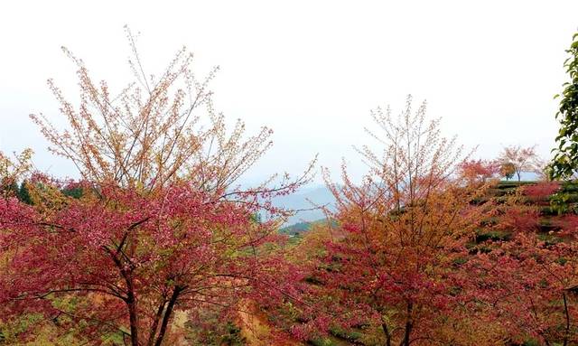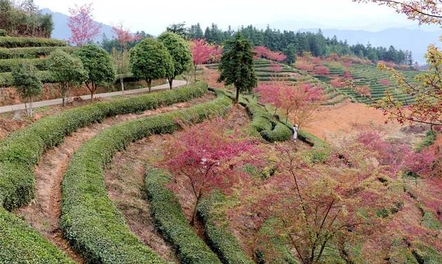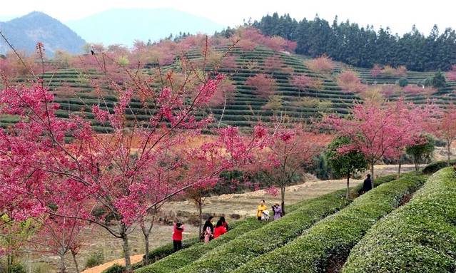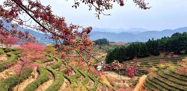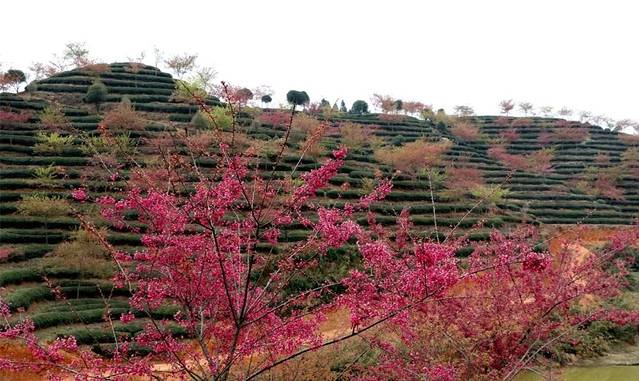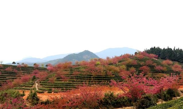 又是一年春来早‘樱花在许多人心目中成为了浪漫和春天的代名词。想看大片樱花不需要去日本也不需要去武汉,去忠信就对了。最近的忠信茶园内大片樱花如期绽放,让游客应接不暇。粉红的樱花,绿色的茶园,在山野朦胧的视野中别有一番味道。