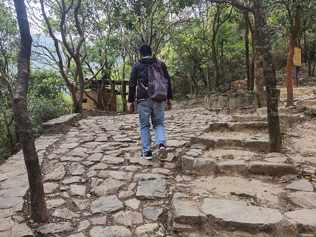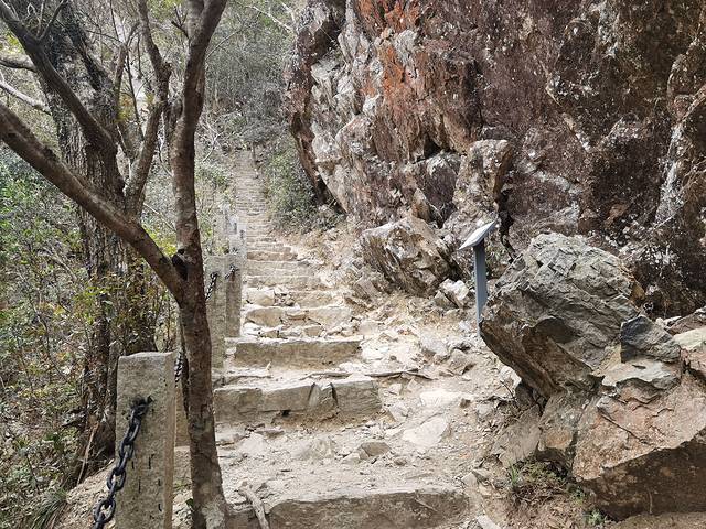 从山下深圳大鹏半岛国家地质公园博物馆附近的主峰科考线入口,沿着崎岖山路拾阶而上。沿途散落着6个歇脚点和四个观景平台,回望来路,尽皆美景。即便是同一个参照物,在不同的海拔俯瞰,景色也大不相同。真可谓移步换景。