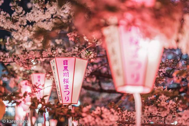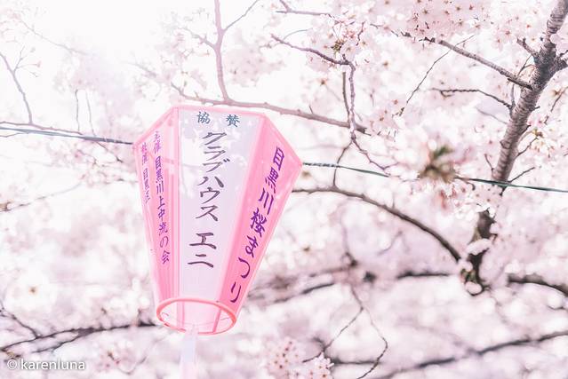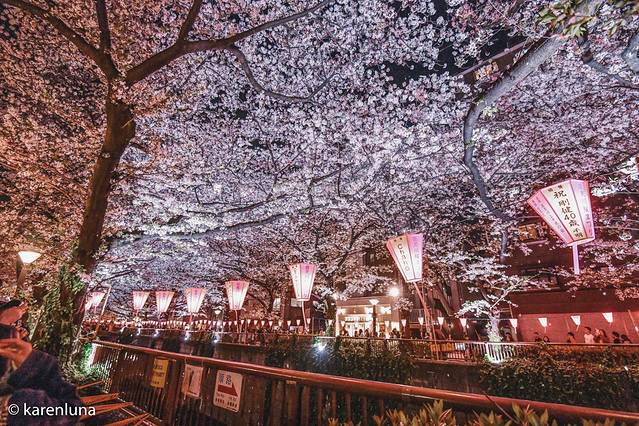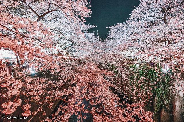 而夜晚的目黑川虽然被灯光照射得梦幻绚烂,但是游客多到真可以用“人山人海”来形容了。从出了地铁开始一直到目黑川的桥头,都只能跟着前面的人慢慢挪动,再加上路两边多了一排卖小吃的路边摊,真有种春节逛庙会的既视感。所以想要拍到夜樱人像,那就还是不要做梦了~~