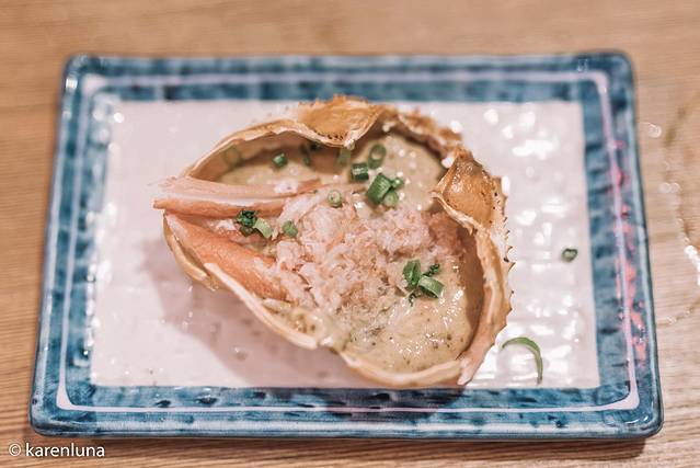 而驱使我一次又一次光顾这里的就是店里的招牌:味增蟹壳烧。一整个蟹壳里,全都是咸鲜浓郁的蟹黄和蟹肉,再混合着味增酱料,看上去有些土黄色。放在火上烤3-5分钟,壳里的蟹黄从开始的咕嘟咕嘟冒着泡,再到渐渐泛出黄色的油光…用筷子搅拌均匀之后放入口中,蛋黄的咸鲜混合物味噌的香味,简直太完美!现在想起那个味道还忍不住溜口水。要知道写这段话的时候已经是深夜,真是太罪恶了。