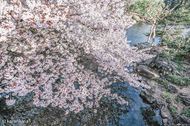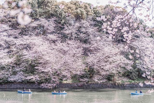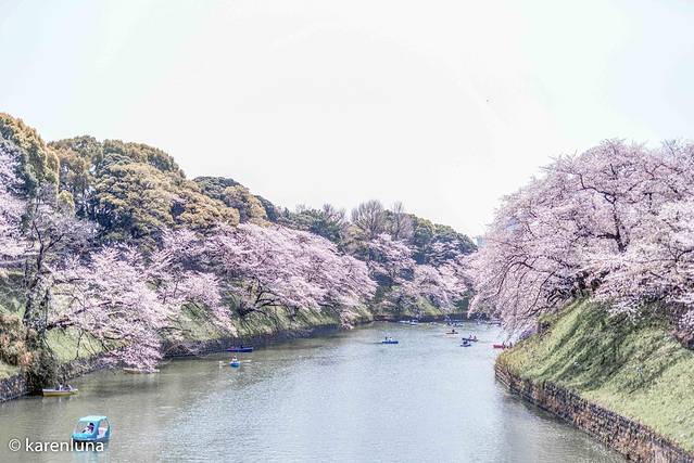 不过此时的千鸟渊只是樱花满开后花瓣刚刚开始掉落,湖面上只有些许散落的花瓣,还未到这里的最美时节,想象着再过几天两岸开始下樱花雨,形成一整片粉色湖面的时候,那画面感才是最美的!